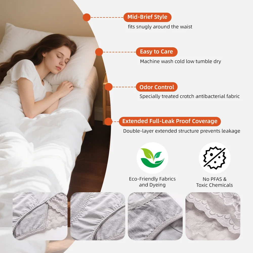 Menstruationsunterwäsche mit mittelhohem Bund, hochgeschnitten, wiederverwendbar, für jeden Tag, mit Logo am Bund, atmungsaktiv, saugfähig, hochwertig, mit Logo, Kundenservice, aus Modalmaterial, verschiedene Größen, auch für Erwachsene geeignet.