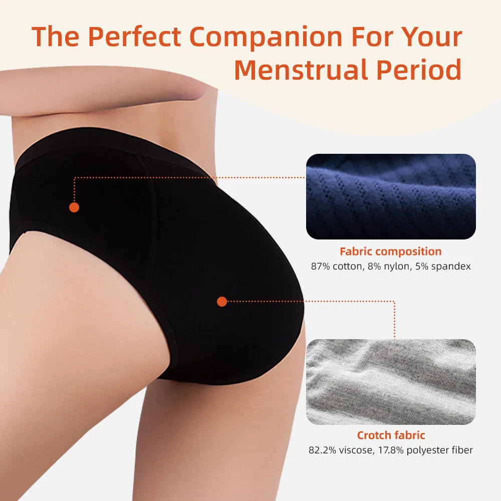 Menstruationsunterwäsche mit mittelhohem Bund, hochgeschnitten, wiederverwendbar, für jeden Tag, mit Logo am Bund, atmungsaktiv, saugfähig, hochwertig, mit Logo, Kundenservice, aus Modalmaterial, verschiedene Größen, auch für Erwachsene geeignet.