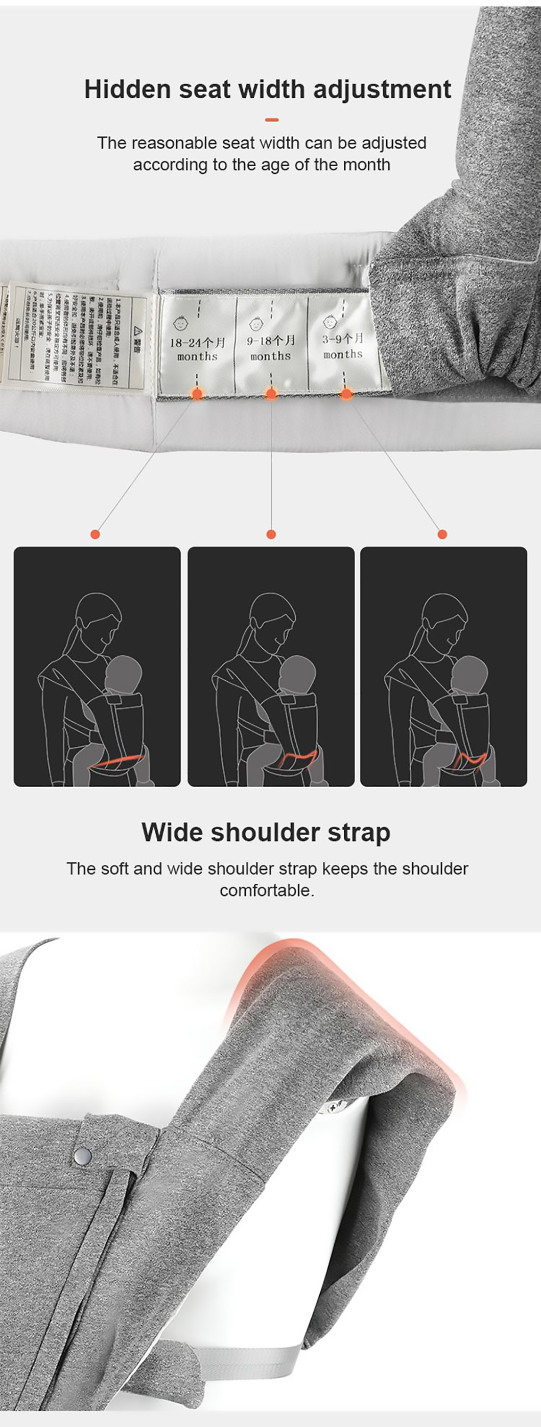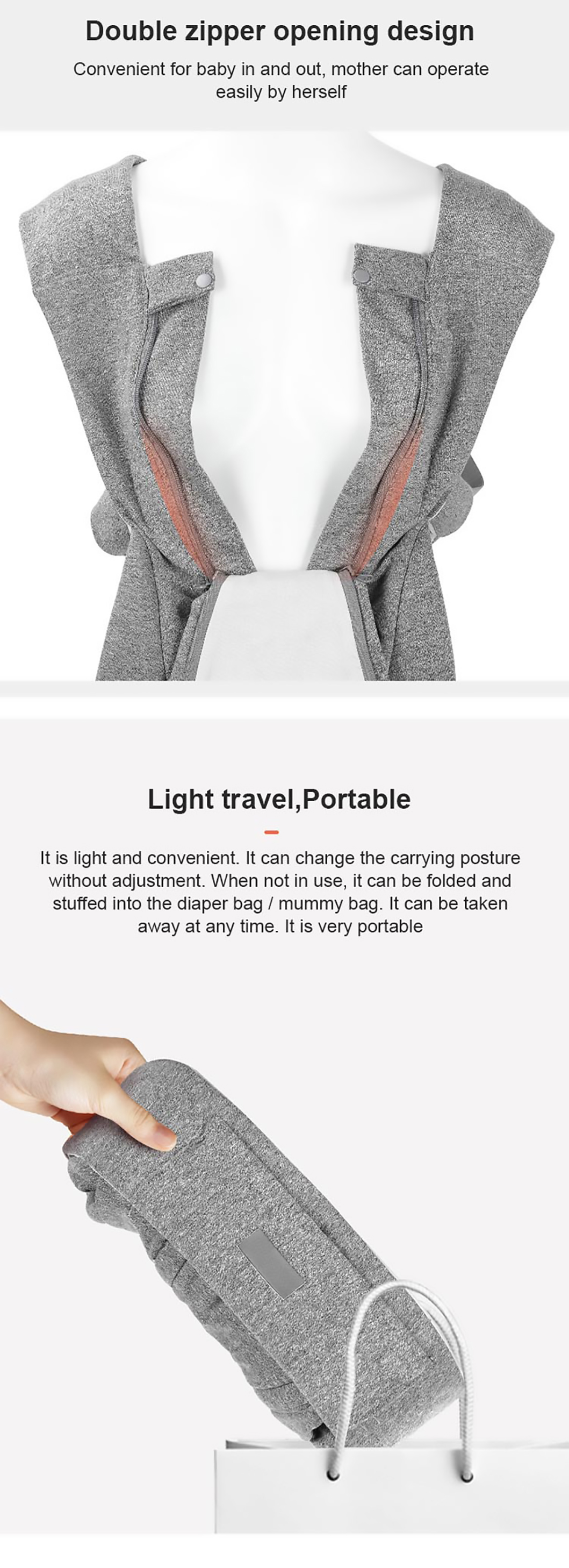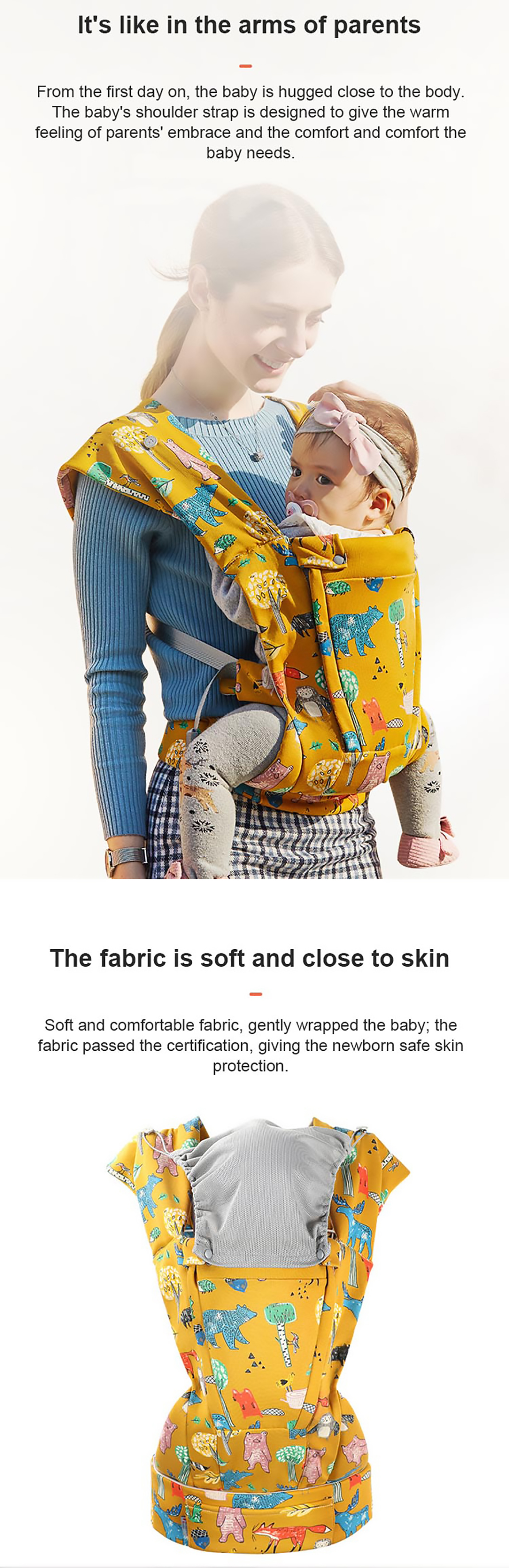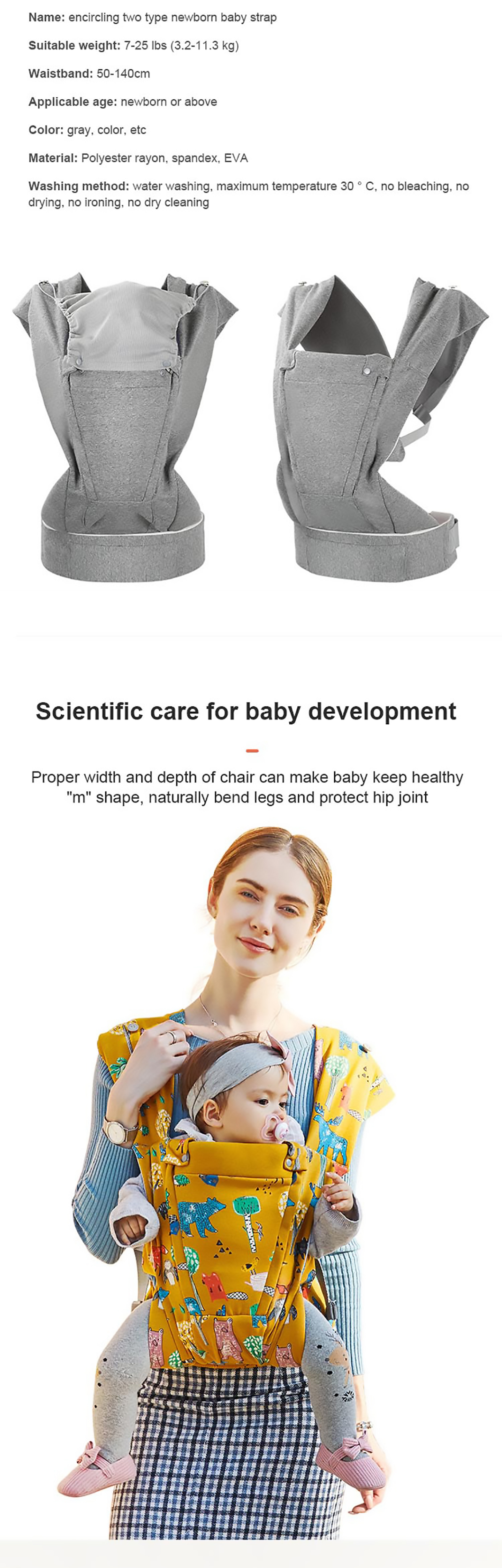 1. Ergonomisches Design: Die hochwertige Babytrage bietet eine umwandelbare Sitzposition, die von Angesicht zu Angesicht, Rücken an Rücken, Rücken an Rücken und in anderen Positionen eingenommen werden kann, um Ihrem Baby umfassende Pflege und Unterstützung zu bieten.