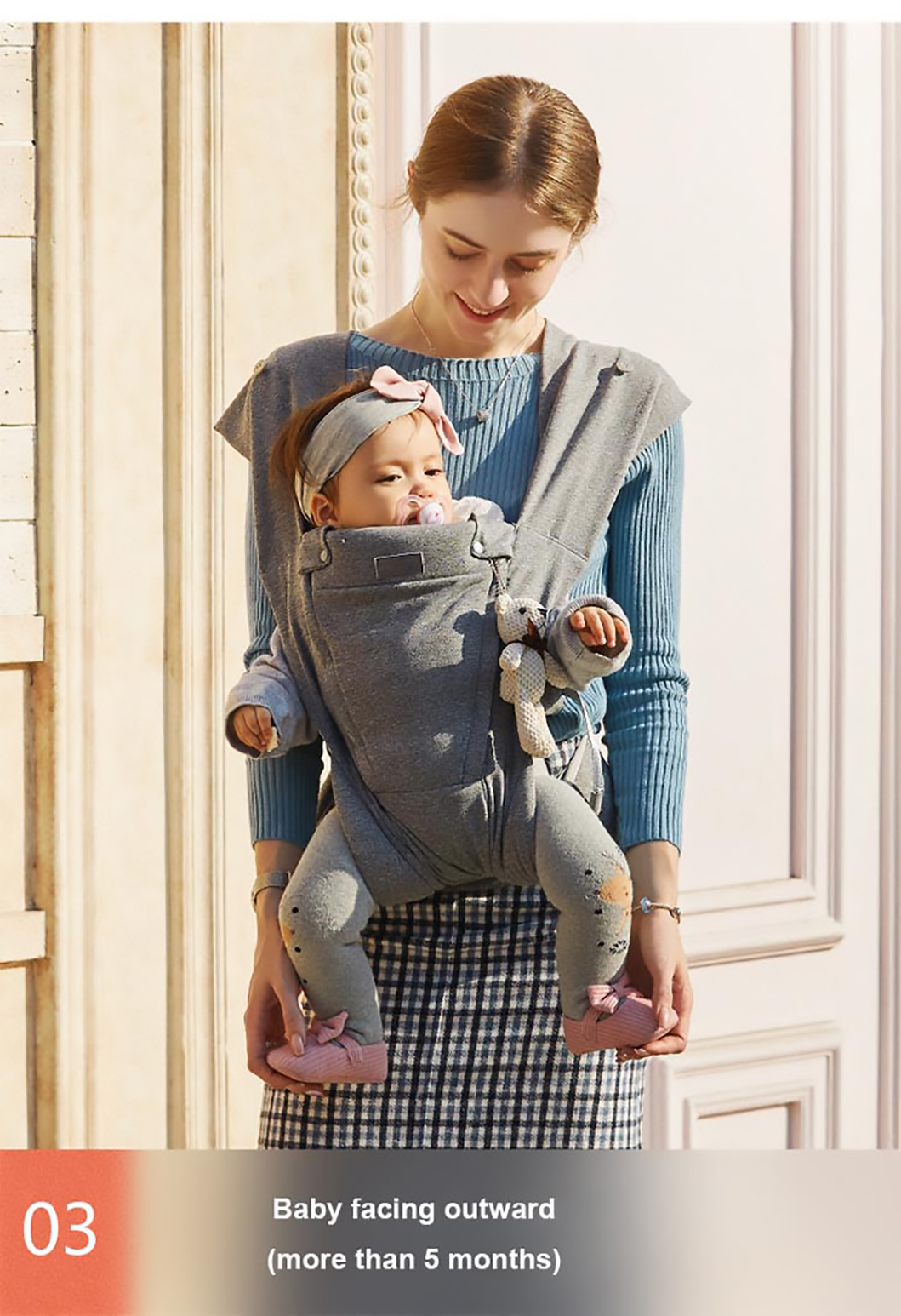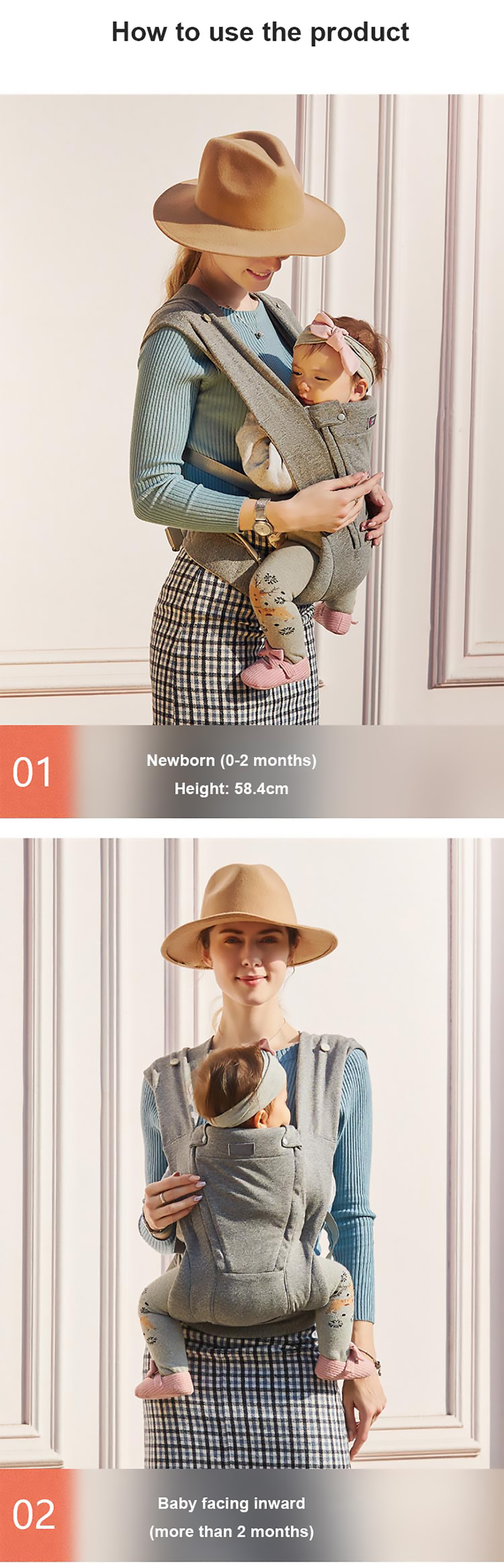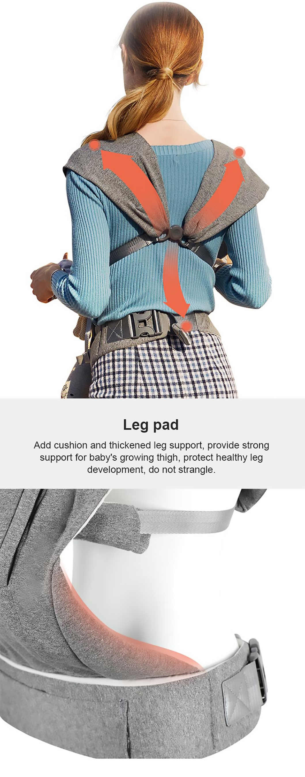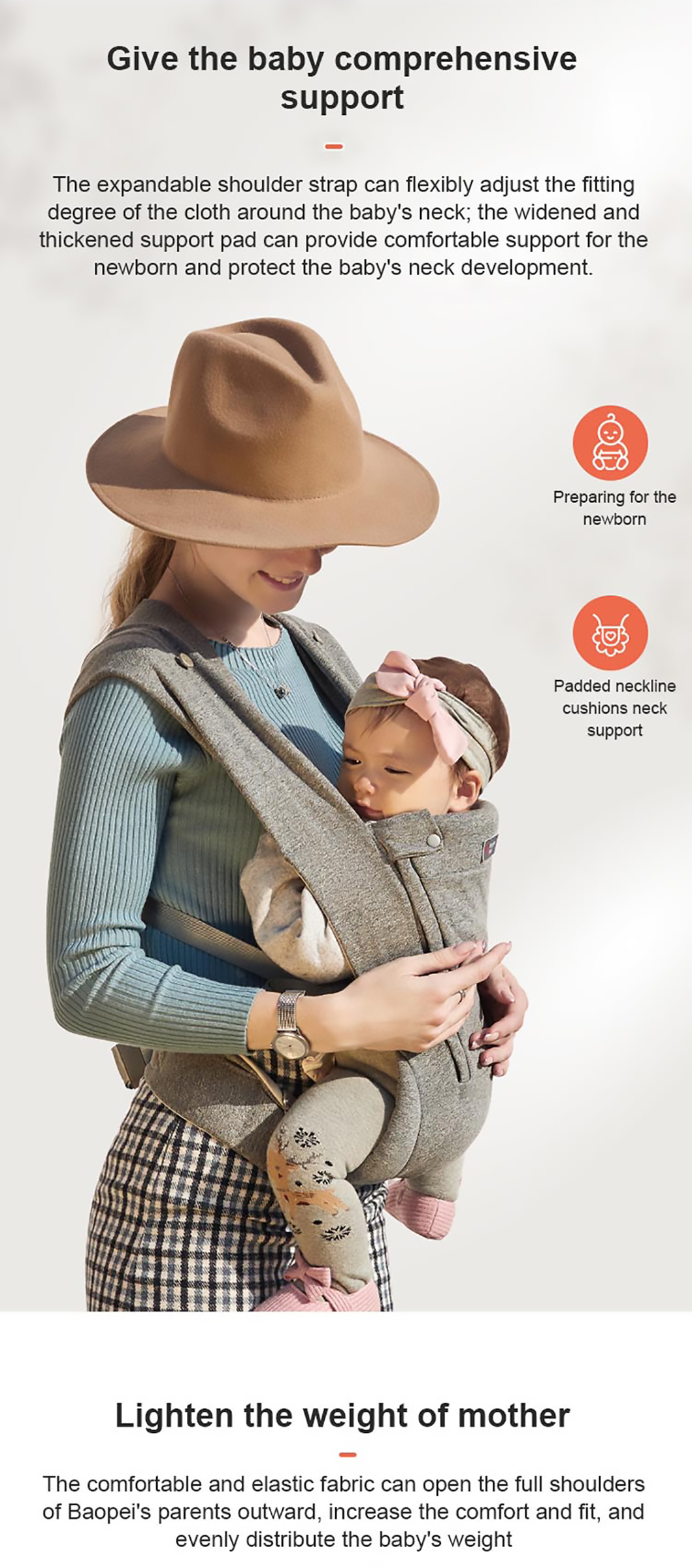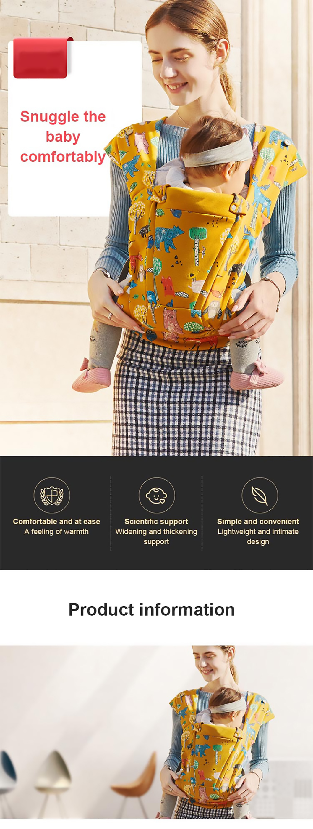 1. Ergonomisches Design: Die hochwertige Babytrage bietet eine umwandelbare Sitzposition, die von Angesicht zu Angesicht, Rücken an Rücken, Rücken an Rücken und in anderen Positionen eingenommen werden kann, um Ihrem Baby umfassende Pflege und Unterstützung zu bieten.